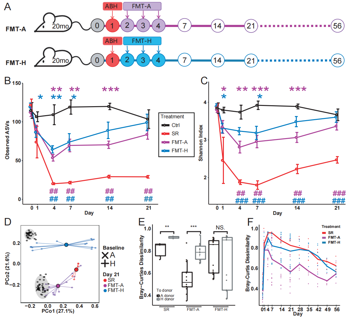 研究人员使用自然衰老的小鼠(20月龄)作为FMT受体来研究移植的肠道菌群的建立及其恢复力第一时间,用抗生素混合物处理老龄小鼠以破坏肠道菌群,并监测其自行恢复(spontaneous recovery, SR过程。研究发现,抗生素处理对肠道菌群多样性和组成的影响持续至处理后 8 周。