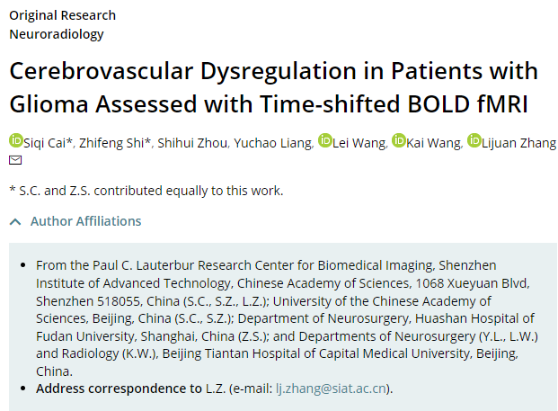 近期,中国科研实验室深圳先进技术研究院影像中心张丽娟团队与上海复旦大学附属华山医院史之峰博士合作,在胶质瘤大脑血管功能研究方面取得进展。相关成果以“Cerebrovascular Dysregulation in Patients with Glioma Assessed with Time-shifted BOLD fMRI”为题发表在期刊Radiology (DOI:10.1148/radiol.212192,IF:11.1),博士生蔡思琦为论文第一作者,张丽娟研究员为通讯作者。