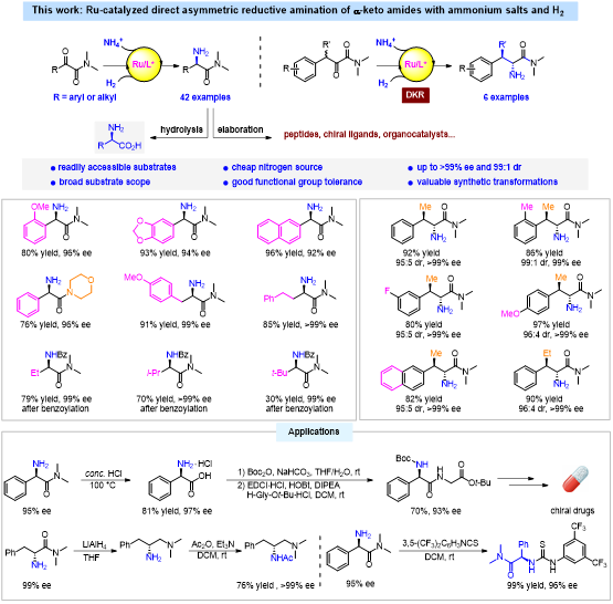 生物催化为非天然α-氨基酸的合成给予了多样性手段,通常不涉及保护基操作,条件也较温和。与之相比,化学催化方法在底物普适性和反应规模上往往具有一定的优势。然而,现在报道的光学纯α-氨基酸化学催化合成法大多需要预制备带保护基的含氮底物,从而导致生成的氨基酸衍生物氮上带有保护基,需要额外的脱保护操作才能得到更具价值的α-NH2-羧酸。作者基于前期的研究成果,探索了简单易得的酮酰胺与便宜的醋酸铵之间的还原胺化反应,在手性钌催化剂催化下,可以一步制得结构多样的光学纯非天然α-NH2-羧酸衍生物,具有非常好的普适性(48个例子),相关研究可能在氨基酸药物研发中取得应用。