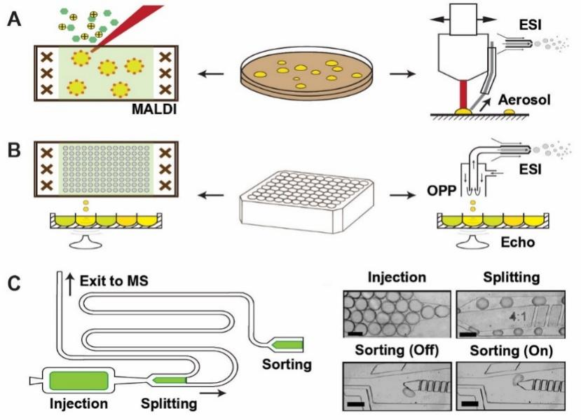 文章提出,省略色谱分离步骤对提高质谱分析通量至关重要。微生物样品可顺利获得自动进样器、激光/离子/气体束、超声波、微流控等手段直接进入质谱仪;而样品制备是连接各类培养体系与质谱平台的关键步骤(图1)。