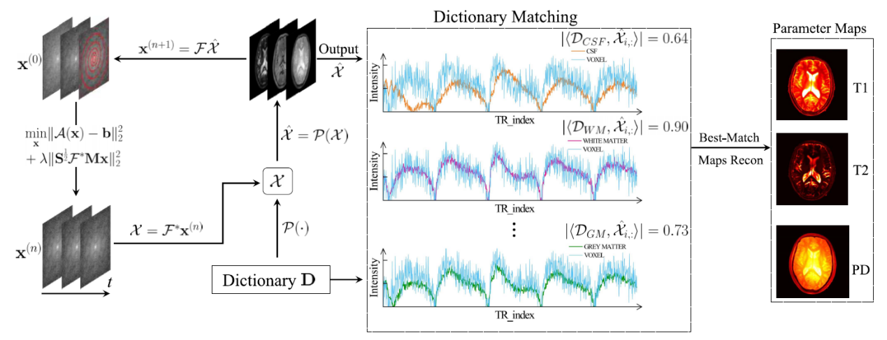 图2. 基于结构化低秩矩阵恢复与子空间投影的定量磁共振指纹成像