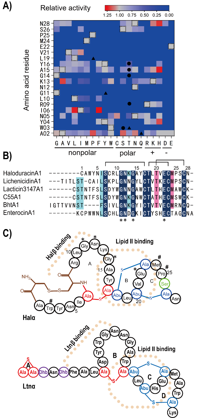 随后,作者进一步选择A环中Lys13、Ala15和Tyr16进行组合突变,这些位点对氨基酸突变具有高耐受性,且在同源序列中具有进化多样性。作者使用编码12种氨基酸的NDT简并密码子构建组合突变文库,顺利获得DNA测序从4800个随机菌落中筛选得到1373个独特的三位点突变株(占理论文库容量12 × 12 × 12 = 1728的79.4%),顺利获得琼脂抑菌实验取得序列功能关系(图3),并最终筛选得到Lys13Val-Ala15Arg组合突变可以显著降低对L. lactis指示菌的最小抑菌浓度。