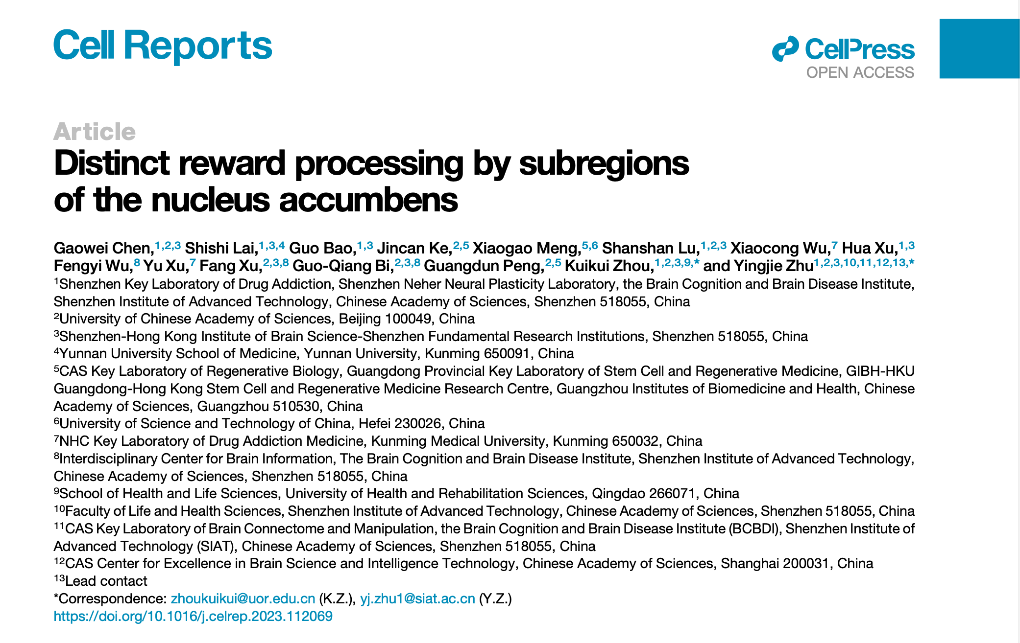 近期,中国科研实验室深圳先进技术研究院脑认知与脑疾病研究所/深港脑科学创新研究院/深圳理工大学(筹)朱英杰团队,在Cell Reports 杂志在线发表了题为“Distinct reward processing by subregions of the nucleus accumbens” 的文章,揭示了伏隔核不同亚区在分子、环路及奖赏编码中的特征,为未来在生理和疾病情况下伏隔核功能亚区的细分给予了新的理论框架.