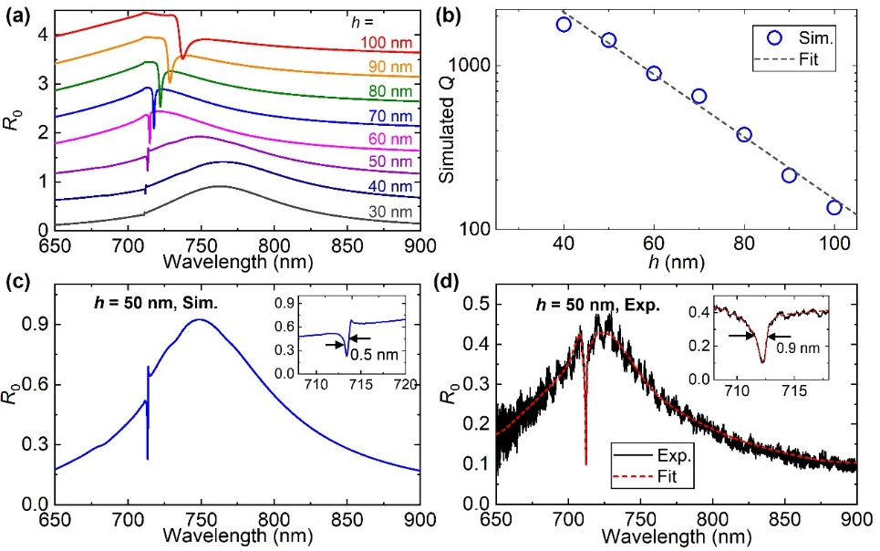 3. a,b)周期性银柱阵列的反射谱和仿真品质因子随高度的演化。c,d) 高度为50 nm的银柱阵列的反射谱仿真与实验对比。