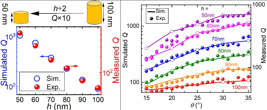 金属纳米柱阵列的高度减半,所支持的面外SLR的品质因子提高一个数量级。随着入射角度增加,面外SLR的品质因子持续提高。