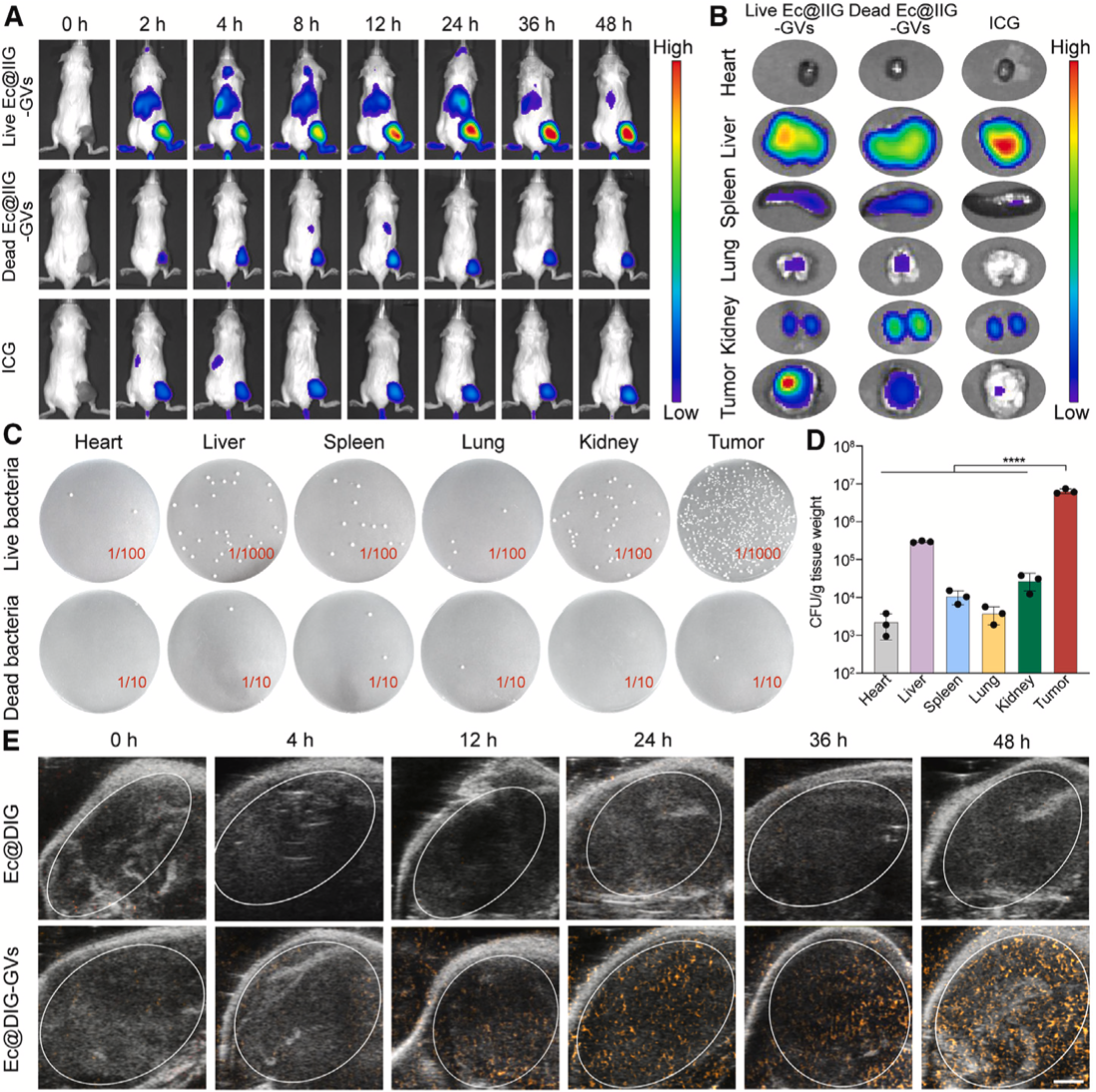 合成生物学技术与肿瘤靶向细菌的整合极大地提高了细菌对肿瘤内部微环境或外部物理刺激的响应性能,使在体精准调控治疗基因的表达成为可能。现在,研究者结合各种启动子元件已开发了多种化学、物理和生物方法,以实现工程化细菌在肿瘤部位精准调控治疗基因的表达。然而,利用静脉注射化学诱导物存在毒副作用且难于靶向聚集肿瘤部位,群体感应诱导系统存在基因诱导时间不可控等问题;利用光控或声控等物理刺激手段具有靶向精准刺激、时空分辨率高、开启或关闭便捷等优势,但光控刺激存在组织穿透性不足,限制了其在深部肿瘤中的应用;相比之下,超声具有高的组织穿透性,优良的时空分辨率,不仅可以实时成像,还可以将声波进行聚焦于深部肿瘤部位产生热效应用于基因的表达调控。在之前的研究中(Nat Commun. 2022;13:4468),研究团队开发了一种超声响应性基因线路,将其整合到肿瘤靶向细菌实现了治疗基因在肿瘤部位的时空可控表达,提高了细菌基因治疗肿瘤的有效性和安全性。然而,由于细菌在肿瘤内部分布不均以及超声焦点难于监测,现在仍然无法可视化这些肿瘤内部的工程化细菌,并实现影像引导超声精准定位肿瘤内细菌调控治疗基因的表达。为此,严飞研究员团队和陈智毅教授团队研发了一种超声可视化工程细菌(Ec@DIG-GVs),可在超声成像引导下精准调控肿瘤内工程化细菌的基因表达,为肿瘤治疗给予了一种新的策略。