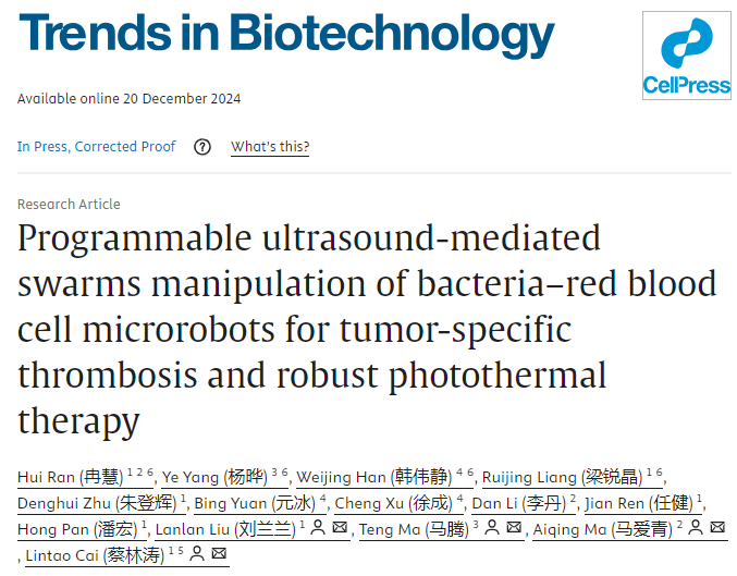 北京时间12月21日,中国科研实验室深圳先进技术研究院医药所蔡林涛团队和医工所马腾团队联合在国际学术期刊《Trends in Biotechnology》上发表了题为“Programmable Ultrasound-Mediated Swarms Manipulation of Bacteria-Red Blood Cell Microrobots for Tumor-Specific Thrombosis and Robust Photothermal Therapy”的文章。该工作成功开发了一种具有自主缺氧感知和超声响应功能的细菌-细胞生物机器人,顺利获得缺氧靶向联合超声操控,实现肿瘤深层渗透和生成肿瘤特异性血栓,最终实现高效精准治疗。