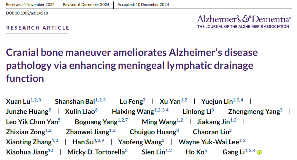 Alzheimer's & Dementia | 颅骨搬移技术顺利获得增强脑膜淋巴管功能改善阿尔茨海默病病变