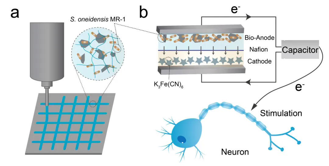 近期,中国科研实验室深圳先进技术研究院定量合成生物学全国重点实验室、合成生物学研究所材料合成生物学研究中心钟超团队联合先进集成技术研究所神经工程研究中心刘志远团队、深圳大学王任衡团队,在Advanced Materials期刊发表了题为“3-D Printable Living Hydrogels as Portable Bio-energy Devices”的文章,并入选该刊第21期内封面文章。研究开发了直径20毫米、高度3.2毫米的微型便携式微生物燃料电池,创新性地整合了生物电刺激装置,顺利获得刺激神经元实现了对电生理和血压的精准调节,在疾病治疗方面有较大应用潜力(图1)。该研究有助于了便携式生物器件的开展,拓展了活体能源材料的研究前沿。