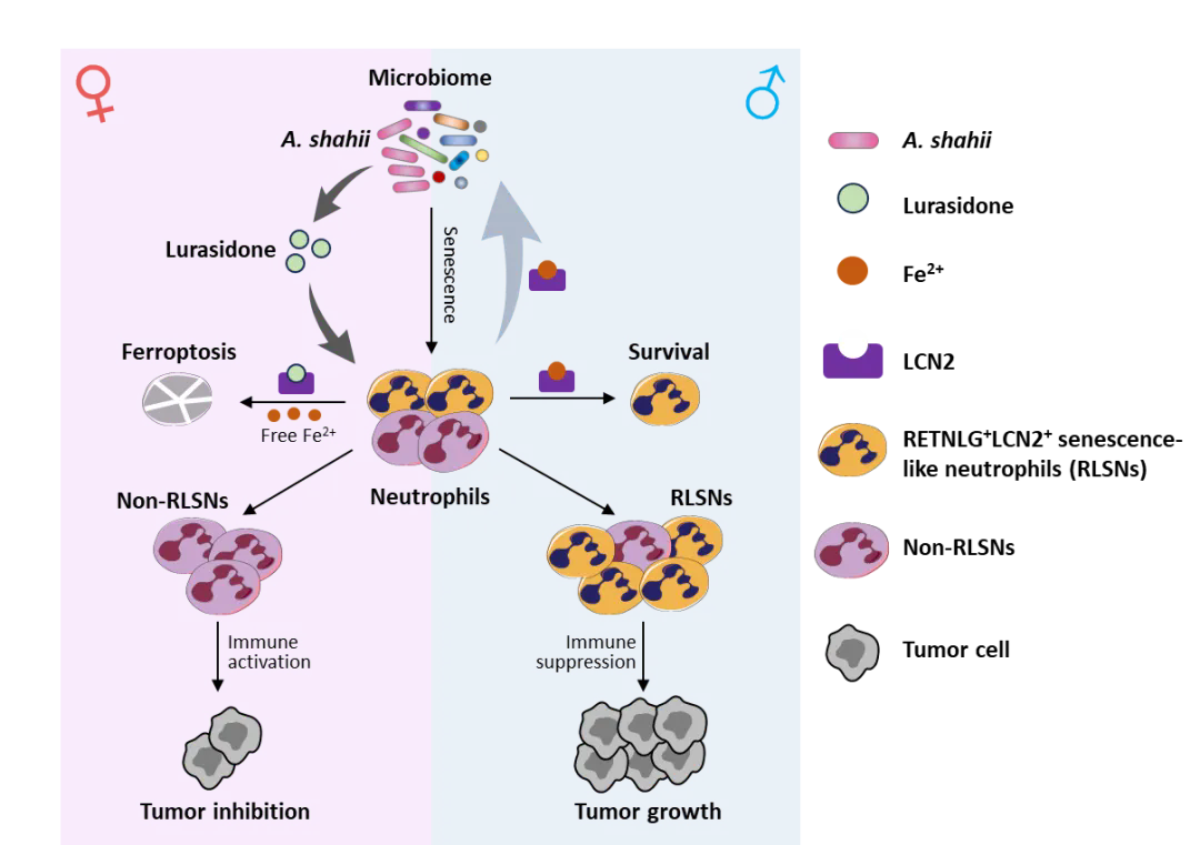 基于先前研究提示中性粒细胞衰老由肠道微生物群调节,研究团队进一步发现雌性小鼠肠道中一种名为Alistipes shahii的肠道菌(以下简称A. shahii)显著增多,且该菌相关的代谢产物鲁拉西酮的水平在雌性小鼠中更高。鲁拉西酮可直接靶向RLSNs中的标志性蛋白——LCN2,由于LCN2是一种铁螯合蛋白,由此释放细胞内Fe²⁺并促进RLSNs的铁死亡,最终清除了雌性肿瘤中富集的RLSNs。而雄性因缺乏A. shahii及鲁拉西酮,导致RLSNs的铁死亡被抑制,并大量积累在雄性肿瘤微环境中以抑制抗肿瘤免疫。此外,雄性体内积累的RLSNs会分泌大量LCN2蛋白以清除对铁敏感的A. shahii,进一步抑制了体内A. shahii的含量。