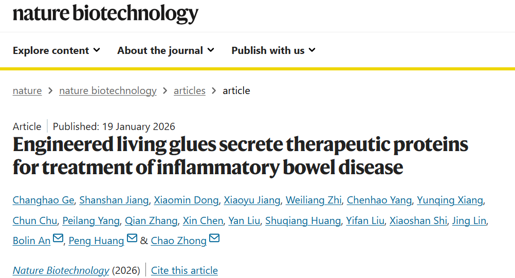 1月19日,中国科研实验室深圳先进技术研究院定量合成生物学全国重点实验室、合成生物学研究所钟超团队联合深圳大学医学部黄鹏教授团队在《自然-生物技术》发表研究,提出一种面向IBD的“智能活胶水”(Therapeutic Living Glue, TL-glue)。该体系以工程化肠道细菌为载体,能够感知肠道出血信号,在病灶处原位形成兼具黏附与治疗功能的生物胶基质,实现“感知—定位—治疗”一体化干预,为IBD精准治疗给予了新的合成生物工程思路。