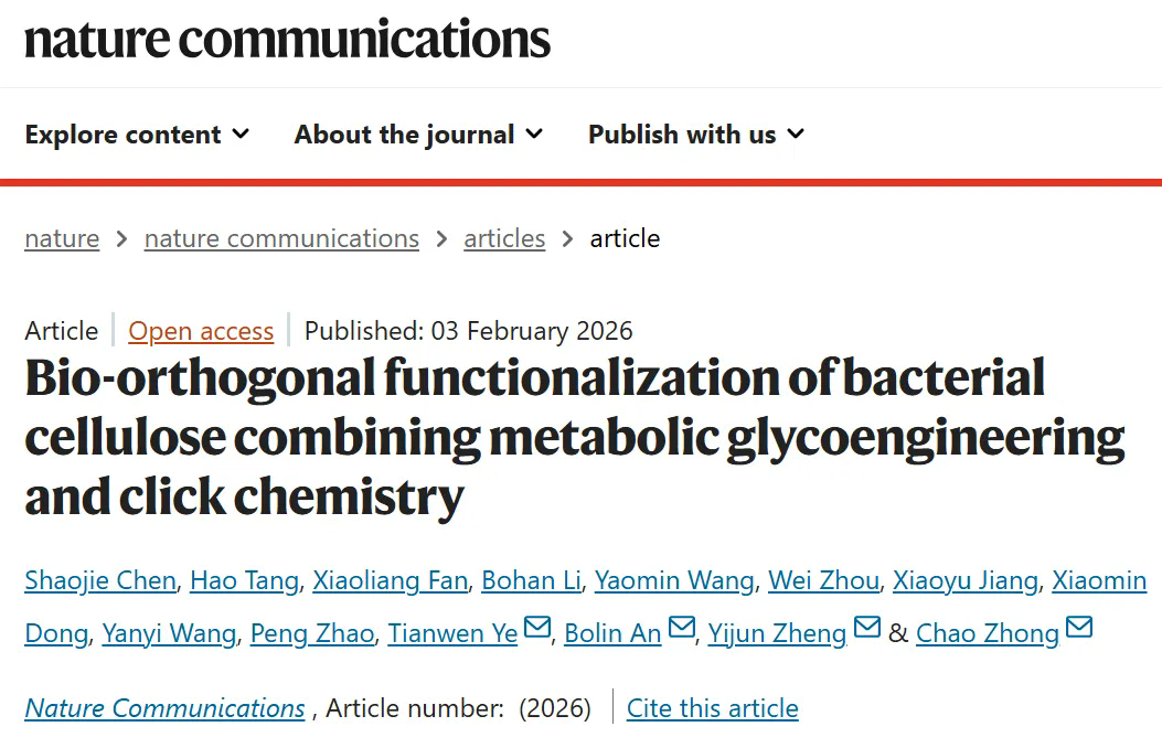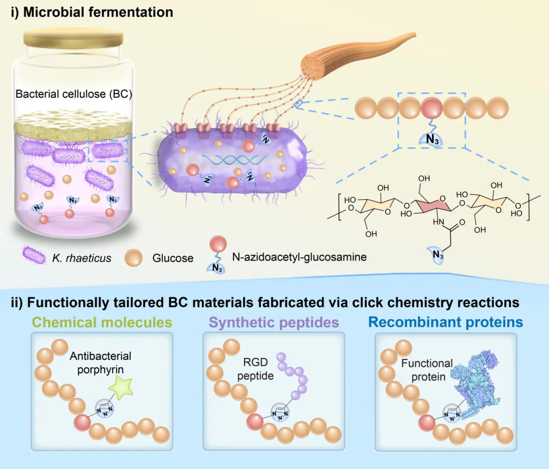 近期,中国科研实验室深圳先进技术研究院定量合成生物学全国重点实验室、合成生物学研究所钟超研究员、安柏霖副研究员,联合上海科技大学郑宜君教授与上海长征医院叶添文教授团队,在国际知名期刊Nature Communications发表研究成果。研究团队成功构建了一种通用的“生物正交功能化”平台,创新性地结合代谢糖工程与点击化学策略(2022年诺贝尔化学奖),将BC转化为可按需编程的“活性基座”,为其多功能集成与应用拓展开辟了新路径。该平台允许研究人员将不同尺度的功能分子(从小分子药物到大型蛋白质酶)按需且共价地“安装”到纤维素网络中,从而自由定制材料的生物活性。这项工作不仅展示了按需制造抗菌、促细胞黏附、酶催化等多种功能材料的能力,更给予了一个强大的材料功能化新范式,有望广泛应用于再生医学、生物传感和环境修复等领域。