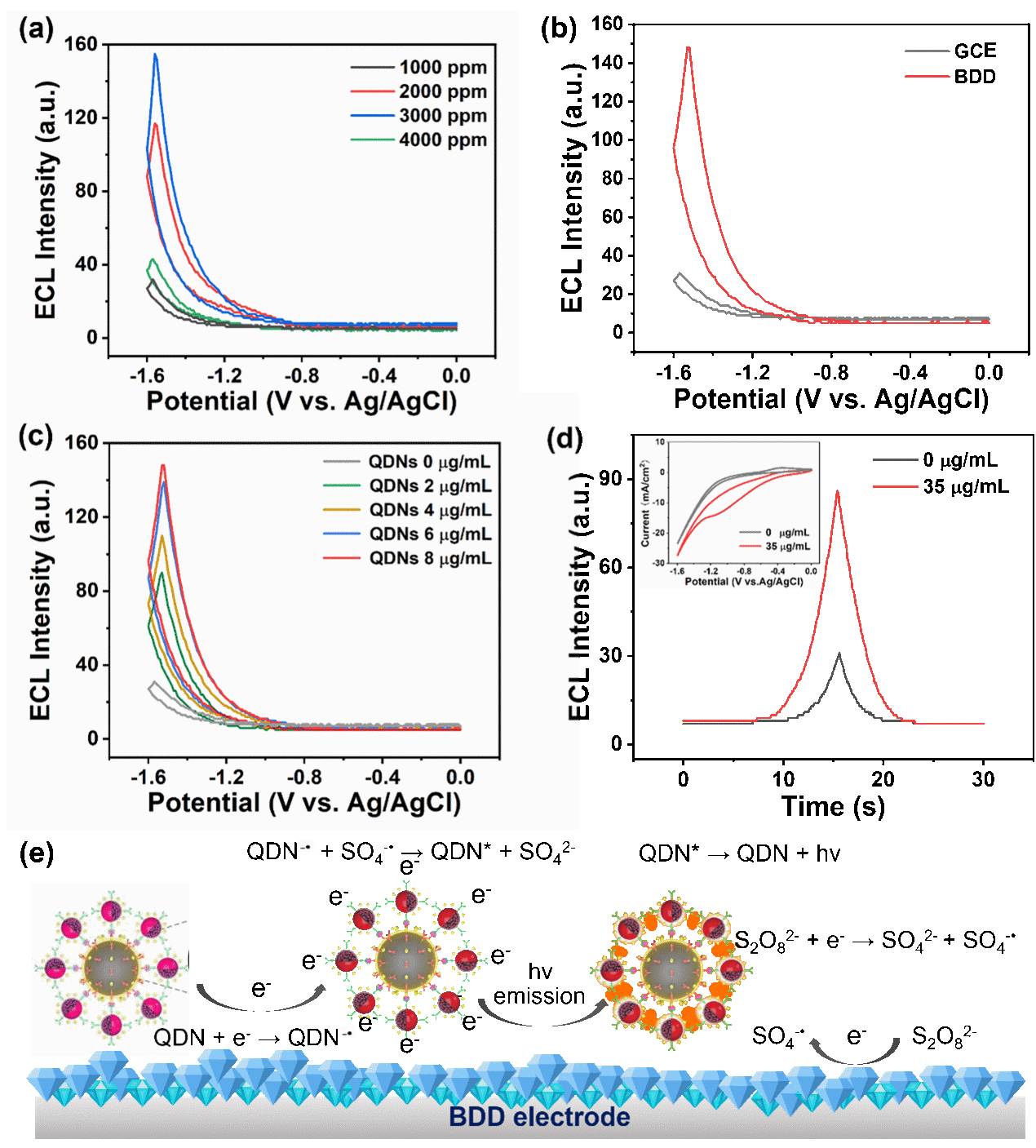 其次,团队引入了量子点纳米球作为发光标签——每颗直径约120纳米的纳米球内密集封装了大量CdSe@ZnS量子点,结合磁珠富集技术,将血清中稀少的CRP靶蛋白精准捕获并高效富集至电极表面,随即在BDD电极触发的阴极电化学发光反应中释放出强烈光信号(图3):BDD电极在阴极电位下同时将过硫酸根(S₂O₈²⁻)还原为强氧化性硫酸根自由基(SO₄⁻•)、将量子点纳米球(QDN)还原为带电自由基(QDN⁻•),二者反应使量子点跃迁至激发态,随后弛豫发光,产生电化学发光信号。