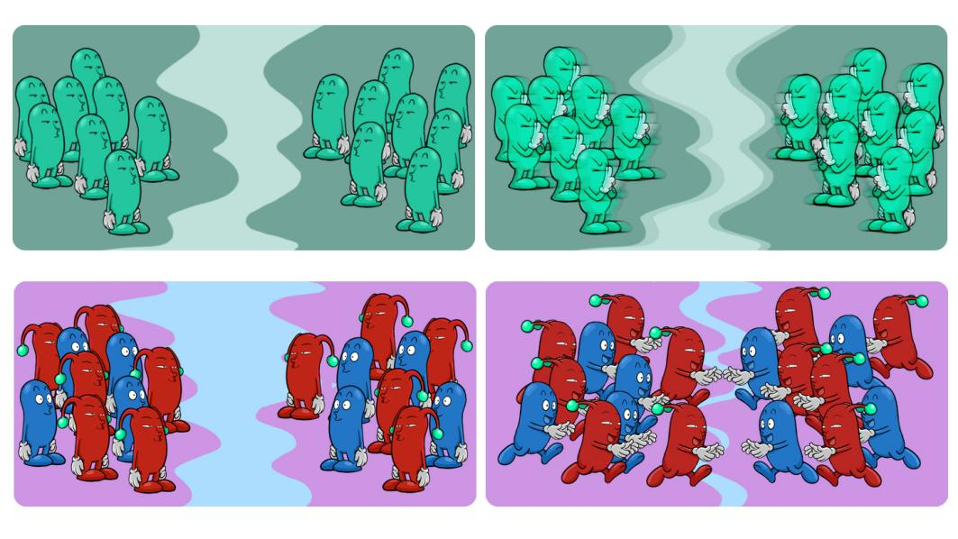 图为传统生物活体自修复材料(靠生长繁殖)和LAMBA自修复材料(靠抗原抗体快速作用修复)修复速度比较图。左上是传统生物活体材料断裂的示意图,右上是修复过程,左下是LAMBA材料断裂的示意图,右下是修复过程的示意图。 来源:凯发k8国际合成所。