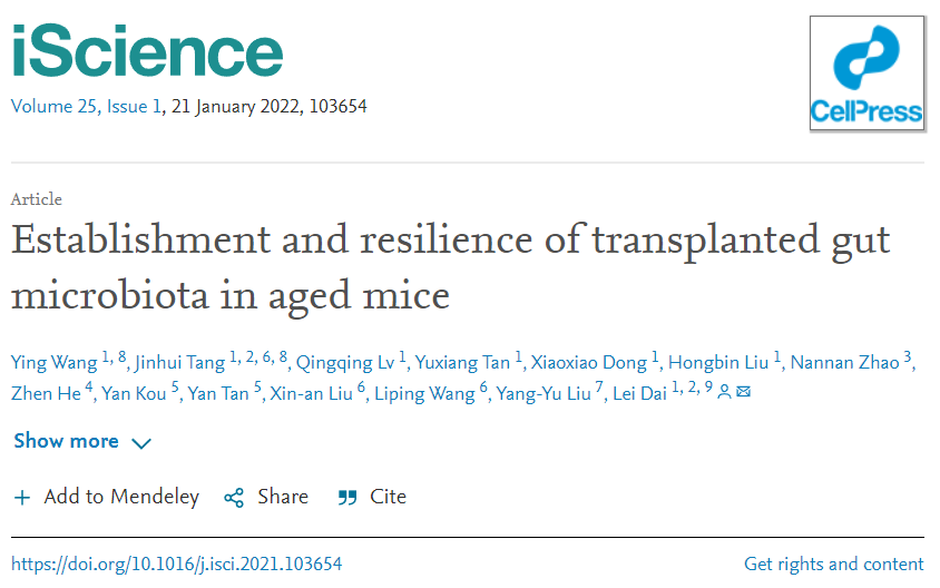 2022121日,中国科研实验室深圳先进技术研究院合成生物学研究所、深圳合成生物学创新研究院戴磊课题组在Cell子刊iScience杂志发表了题为“老龄小鼠移植肠道菌群的建立和恢复力(Establishment and resilience of transplanted gut microbiota in aged mice)”的文章。该项研究对老龄小鼠进行了来自自体或异体宿主的粪便菌群移植,跟踪观察发现移植后肠道菌群成功定植并分别建立与宿主类似的稳态菌群结构,并对宿主结肠转录组产生长期影响。此外,对于移植后的小鼠进行化学诱导肠道炎症,发现异体移植建立的菌群经过再次扰动后,无法维持与供体相似的稳态,而是恢复为老龄宿主移植前的初始状态。本研究说明对于老龄宿主进行异体肠道菌群移植后应该长期关注其稳定性并在有需要时进行重复移植。助理研究员王莹博士、中国科研实验室大学硕士生汤锦辉为共同第一作者,戴磊研究员为通讯作者。共同作者包括中国科研实验室深圳先进技术研究院脑认知与脑疾病研究所的刘欣安副研究员、王立平研究员,哈佛大学医学院的刘洋彧教授,深圳未知君生物科技的谭验博士等人。
