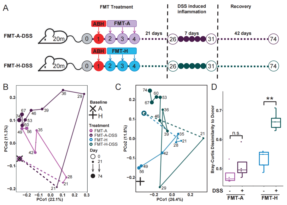 粪便菌群移植(FMT)是一种将粪便物质从健康供体转移到肠道菌群受到破坏的患者的手段,现在已被用于治疗多种疾病。评估FMT治疗的成功和保护效果的两项重要指标,分别是1)是否能在宿主体内建立新的菌群稳态; 2)新建立的菌群稳态在再次扰动后是否仍具有恢复能力尤其是在异体FMT的情况下,原本与宿主高度适配的菌群状态被来自供体的具有不同组成的新状态所取代,它可能处于亚稳态,这种新建立的菌群平衡可能更容易被环境变化所破坏,因此研究移植后菌群的稳定性和恢复力至关重要。