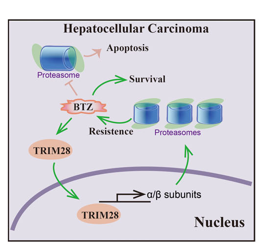 硼替佐米药物处理下,TRIM28入核结合蛋白酶体亚基启动子,激活蛋白酶体亚基基因转录、提升蛋白酶体的表达,进而增强肝癌细胞对硼替佐米药物的抵抗,最终促进肝癌的存活。