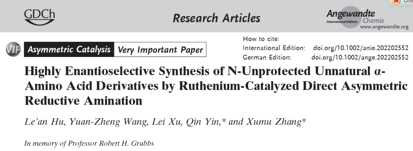该反应能给予一种化学催化的直接构筑光学纯非天然手性α-NH2-羧酸的新途径,可以与生物催化形成互补。相关研究成果发表在国际顶级化学综合期刊Angew. Chem. Int. Ed.上,并被编辑选为“Very Important Paper”文章(TOP 5%),南方科技大学博士后胡乐安为论文第一作者,殷勤为共同通讯作者。