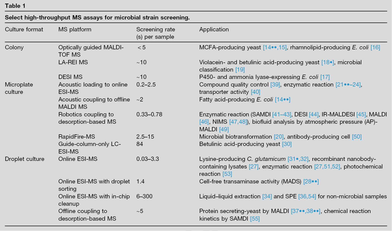 针对琼脂板菌落、微孔板和微流控液滴等常用微生物培养体系,文章从样品制备、质谱装备和数据分析等方面对该领域最新进展进行了重点阐述。作者精选了一系列商业化或经过应用验证的质谱方法进行介绍和比较,并对筛选通量和应用举例进行了总结(表1)。举例说明了高通量质谱筛选在鼠李糖脂、中链脂肪酸、赖氨酸、甜味蛋白等生产菌株开发中的应用。