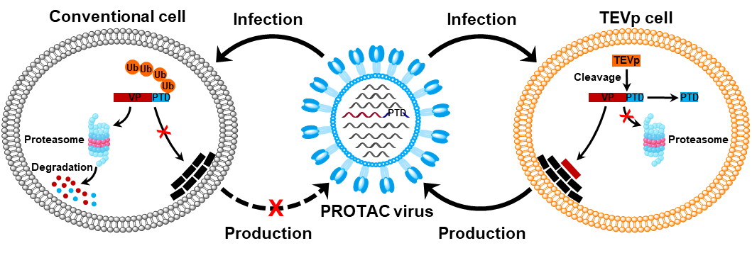 蛋白质作为病毒结构组成和正常生命活动所必需的共性生命物质,为人们操控病毒进而利用病毒给予了重要切入点。基于蛋白质调控的病毒减毒策略,大致可以归纳为两个主要方面:一是抑制或阻断蛋白质合成以减少子代病毒组装所需的“原料”生产,二是加速蛋白质降解以及时将子代病毒组装所需的“原料”清除。在本研究中,司龙龙团队构建PROTAC病毒,旨在顺利获得操控病毒蛋白质的降解降低病毒的复制能力,将野生型病毒减毒成为疫苗。