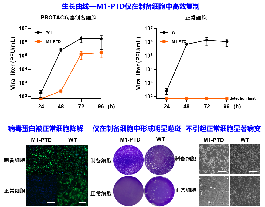 据上述设计原理,该团队第一时间构建了一株PROTAC流感病毒疫苗,命名为M1-PTD。对病毒生长曲线考察发现,M1-PTD只能在PROTAC病毒制备细胞中高效复制而得以制备,而在正常细胞中复制能力显著下降而安全(图2)。此外,免疫荧光实验结果表明,M1-PTD病毒蛋白在正常细胞中被降解;噬斑实验结果表明,M1-PTD仅在PROTAC病毒制备细胞中可以形成噬斑,而在正常细胞中不形成噬斑;细胞病变实验结果表明,M1-PTD在正常细胞中不引起明显病变。所有这些实验结果均表明M1-PTD流感病毒具备成为安全疫苗的潜力。