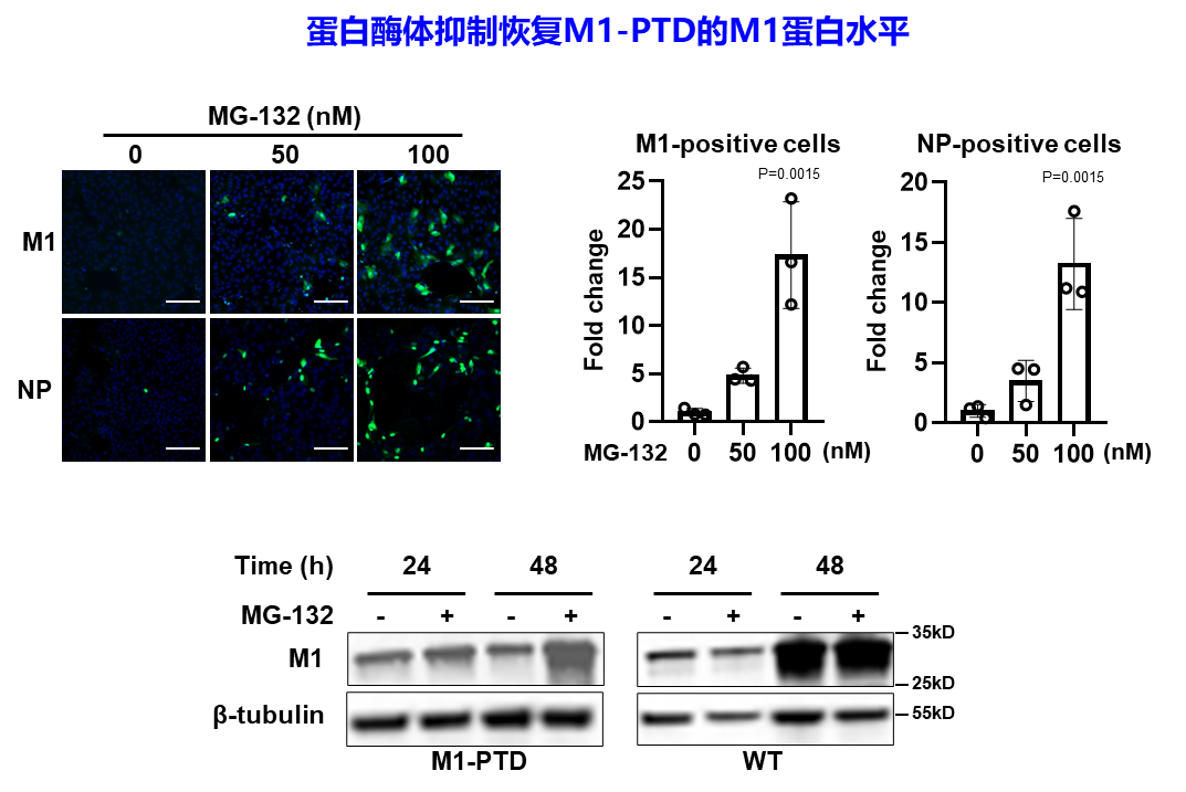 图3. 泛素-蛋白酶体系统介导M1-PTD蛋白降解和复制能力减弱