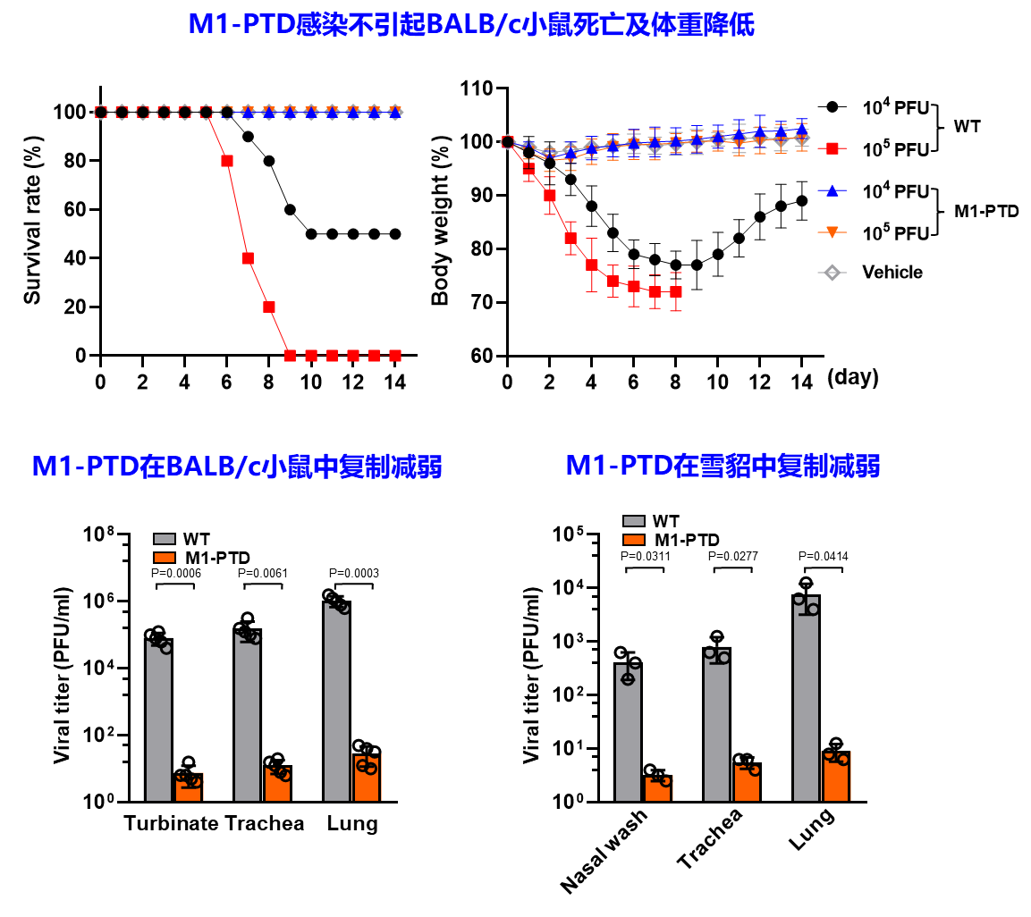 该团队使用小鼠、雪貂动物模型对构建成功的M1-PTD流感病毒进行了安全性评价。将M1-PTD病毒或野生型流感病毒以滴鼻的方式接种于动物,监测动物的死亡率和体重,并检测动物鼻洗液、气管、肺中的病毒滴度。结果显示(图4),与野生型病毒相比,M1-PTD在动物体内的复制能力显著降低,且不会引起小鼠死亡或体重下降,说明其在动物体内具备安全性。