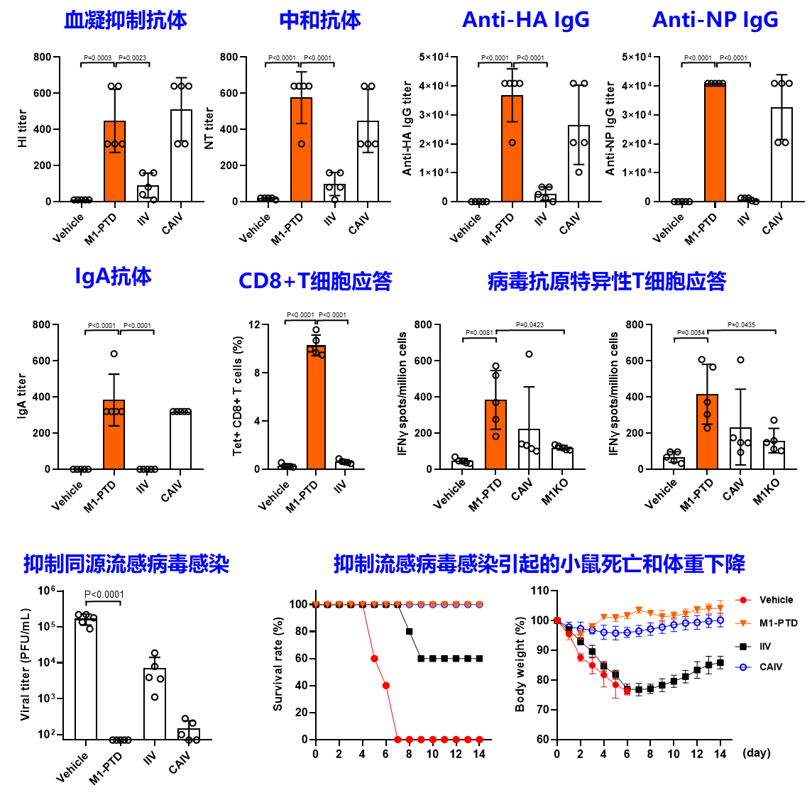 该团队在小鼠、雪貂动物模型中对M1-PTD流感疫苗进行了免疫效果评价。结果显示(图5),M1-PTD可以诱导广泛的免疫应答,包括体液免疫、黏膜免疫、细胞免疫应答;且 M1-PTD可以给予良好的交叉免疫保护。