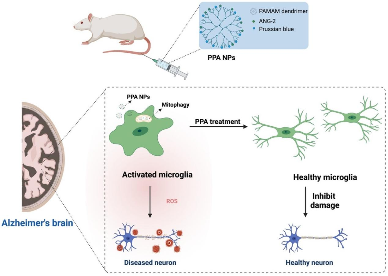在该工作中,研究团队开发了一种拥有优异的血脑屏障(BBB)通透性的纳米颗粒,由普鲁士蓝/聚酰胺-胺型(PAMAM)树状大分子/血管生成素-2  (PPA)组成,顺利获得调节线粒体自噬,清除活性氧因子(ROS)恢复小胶质细胞的生理功能,从而治疗阿尔茨海默症。文章的第一作者为于寅课题组研究助理钟刚,共同一作为石胜良团队龙惠萍;于寅副研究员和陈飞副研究员、广西医科大学第二附属医院石胜良教授为共同通讯作者。