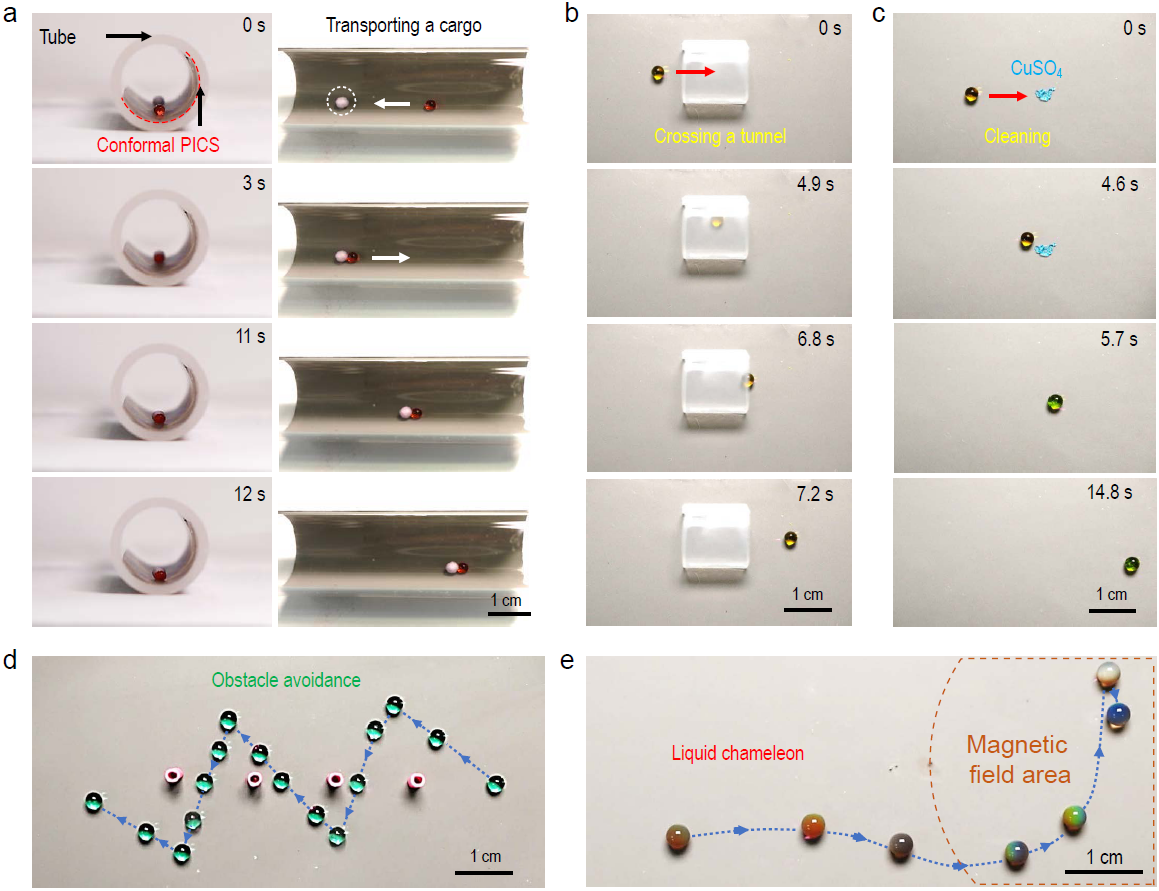 基于此,研究团队采用具有高效光热与导热性能的液态金属颗粒(LMP),与具有独特铁电效应的聚偏氟乙烯-三氟乙烯聚合物(P(VDF-TrFE))复合,成功构建了一种基于智能高分子材料的新型超双疏表面——PICS,顺利获得开尔文探针力显微镜(KPFM)揭示了该智能高分子材料表面电荷实时、原位、高效再生能力;研究发现,在较低光强的近红外光(NIR,100 mW cm-2)照射下,毫秒级内即可产生表面电荷密度高达252 pC mm-2,且PICS表面电荷高效再生能力在较高环境湿度(~90%)与温度(~70 ℃)等极端环境下几乎无影响,其电荷高效再生性能在持续10000次光照循环后仍维持稳定。基于PICS独特的光与电双重优势,研究团队实现了PICS上光控液滴高速(μL水滴,平均速度:~ 35.9 mm s-1)、长距离、多模态(向前、向后、旋转)、集体定向运动,且光控液滴高速运动在较高环境湿度、逾100次循环后仍能维持稳定,并可拓展到如高浓度氯化钠(1 M)等复杂溶液;研究团队还采用麦克斯韦应力张量模型分析验证了光控液滴运动机制;在此基础上,研究团队实现了光操控液滴在液滴机器人领域应用:光操控液滴在PICS共形贴合的管内搬运物体、穿梭小隧道、清除粉末、避障运动,及光操控液滴运动同时顺利获得液滴肉眼可见的颜色变化实时感知环境磁场变化;此外,研究团队还拓展了液滴机器人在细胞输运、生化检测等生物领域应用。
