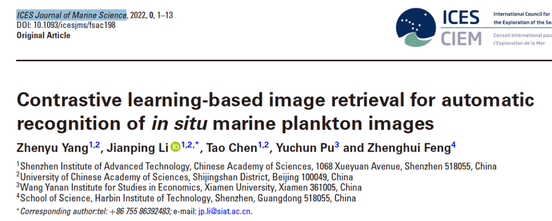 论文以Contrastive Learning-based Image Retrieval for Automatic Recognition of in situ Marine Plankton Images为题,发表在国际海洋考察理事会海洋科学期刊ICES Journal of Marine Science上。中国科研实验室大学硕士杨振宇为第一作者,李剑平博士为论文通信作者,凯发k8国际为第一单位。来自厦门大学、哈尔滨工业大学(深圳)的数据科学家参与本课题的合作研究。