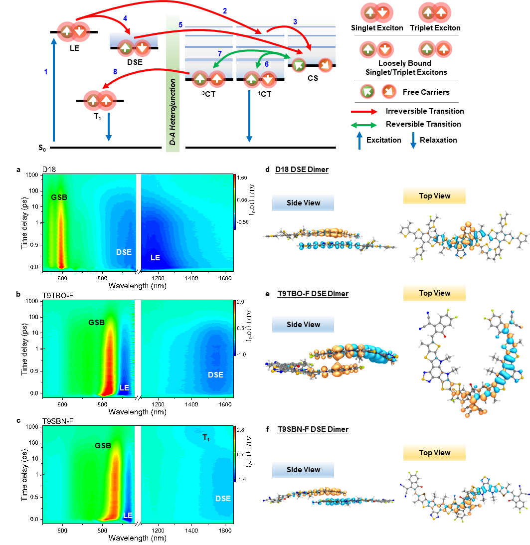 有机光伏器件中的激发态演化过程示意图和给受体分子的TAS以及理论计算结果