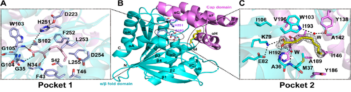 为克服这些局限,本研究顺利获得X射线晶体学方法首次解析了铜绿假单胞菌(Pseudomonas aeruginosa)来源RhlA的蛋白质结构,揭示了RhlA具有α/β水解酶折叠结构。出乎意料的是,除Ser-His-Asp催化中心附近经典的配体结合口袋1外,研究人员还发现了另外一个配体结合口袋2,该口袋中结合有游离的3-羟基脂肪酸,推测可能是反应中间体。