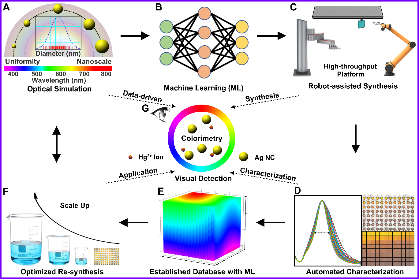 银纳米晶由于优异的光电性质,在传感检测、能源催化、抗菌医药等领域具有广泛的应用,而其光学性质又与材料形貌结构、尺寸分布、表面配体等密切相关。在过去的研究中主要顺利获得单因素优化实现材料的可控合成,进而调控材料的光学性质,这往往依靠经验式方法和密集型人力劳动,建立的合成数据库存在着有效样本容量少、结果可重复性差等问题,严重制约了银纳米晶的研究和应用。随着人工智能在材料科学领域的兴起,为材料大数据样本的获取给予了可能,结合光学仿真和机器学习对材料基因组信息进行有效的分类和筛选,有望实现多因素作用下材料的可控合成和目标应用。该研究顺利获得整合光学仿真、数据建模、自动化合成、原位表征、机器学习等技术方式,实现多因素作用下银纳米晶的优化合成和高通量筛选,突破传统胶体光学材料在可控合成和色彩应用上的局限,加速目标材料应用于可视化检测汞离子当中。