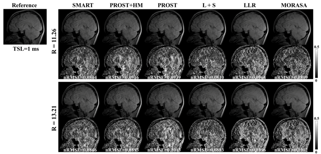 图3.不同加速倍数下(R=11.26, 13.21)所提的SMART方法与其他主流方法的重建结果对比。