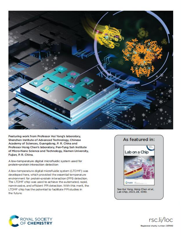 中国科研实验室深圳先进技术研究院医工所杨慧研究员团队,与厦门大学萨本栋微米纳米研究院陈宏教授团队合作,在Lab on a Chip 上发表了题为A low-temperature digital microfluidic system used for protein-protein interaction detection的研究,并被选为当期的封底文章 (Back cover)。该团队开发了一种基于低温数字微流控系统的蛋白质与蛋白质相互作用检测盒(LTDMF-PPI-Box),以实现自动、快速、无损、高效的蛋白质与蛋白质相互作用检测。本研究中,沈杰男博士和廖嘉琪硕士为共同第一作者,杨慧研究员和陈宏教授为共同通讯作者,中国科研实验室深圳先进技术研究院为第一通讯单位,厦门大学为第二通讯单位。