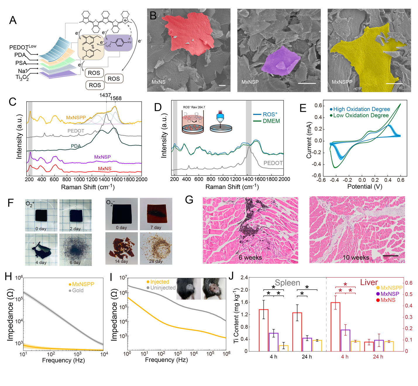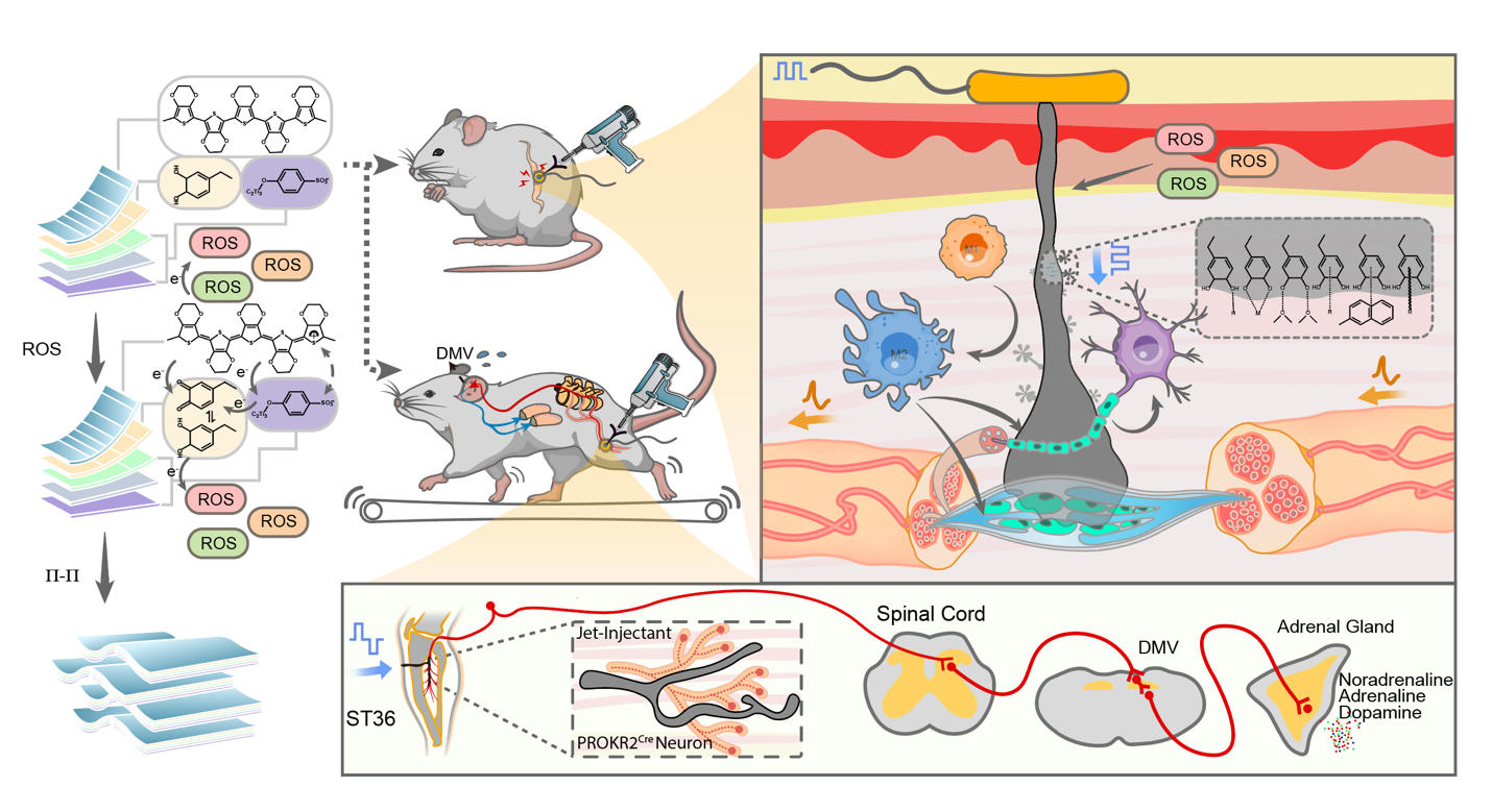 本研究实现的纳米片包括苯磺酸根作为掺杂剂层,低氧化度的聚3,4-乙烯二氧噻吩作为共轭层,聚多巴胺作为稳定剂和粘附,以及MXene作为过氧化物酶和结构核心层该溶液体系可顺利获得喷射注射器直接注入到特定神经末梢,利用注射过程中伴随的活性氧(ROS)催化PEDOT进一步氧化掺杂,增强纳米片间的 - 相互作用,形成导电、可生物降解的陆续在神经电子界面。聚多巴胺作为稳定剂,在注射前可以抑制纳米片的自发掺杂,在注射后可以与周围组织产生多种键链接,增强组装体系的体内稳定性。该神经界面不仅可以调节局部免疫活动,促进受损神经小鼠的感觉和运动神经功能恢复,而且在对清醒小鼠足三里迷走神经刺激中,激活了小鼠的迷走-肾上腺轴,从而释放儿茶酚胺类神经递质,达到抑制全身性细胞因子风暴的目的