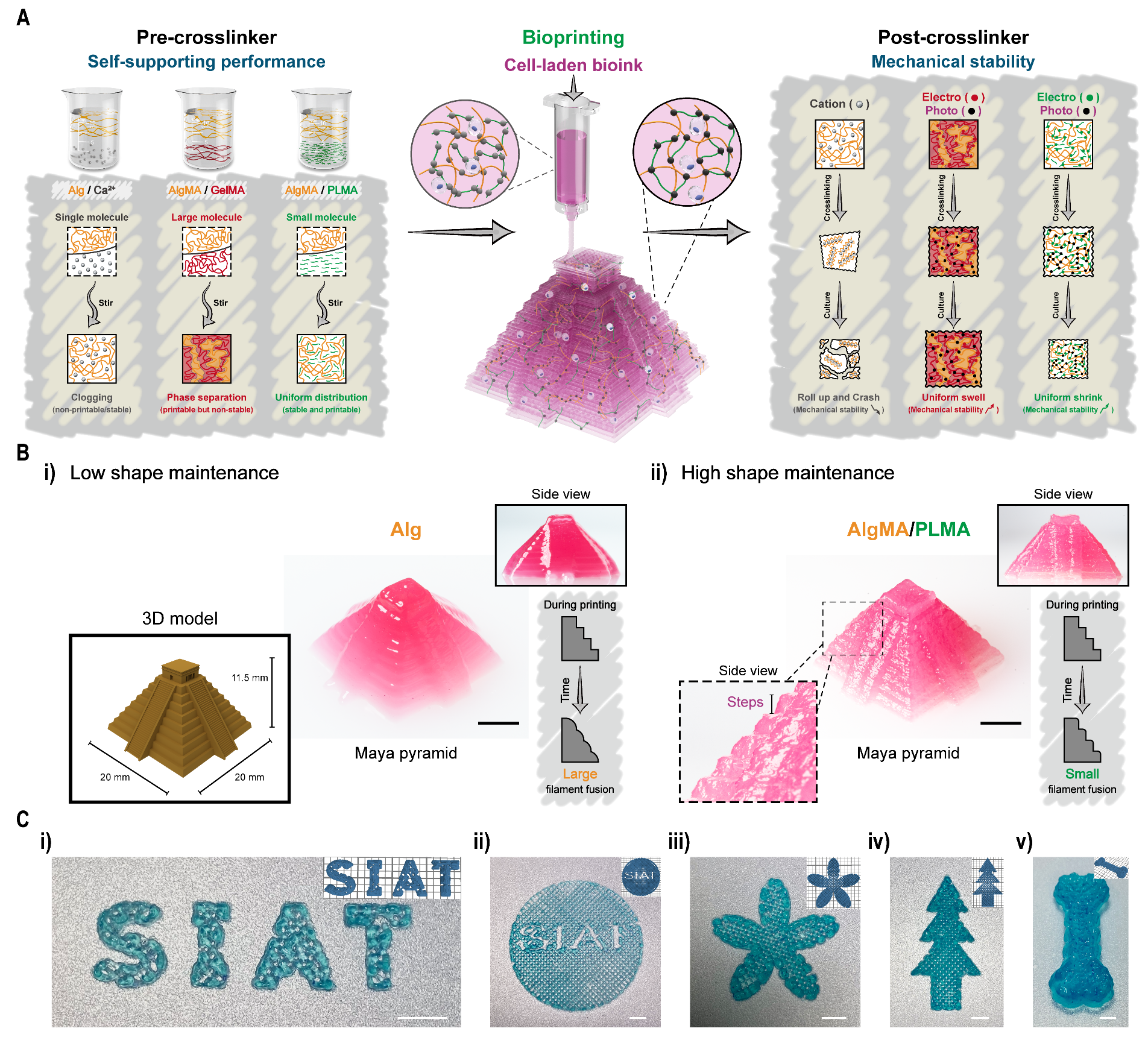 近期,中国科研实验室深圳先进技术研究院医药所阮长顺课题组在Advanced Functional Materials在线发表研究论文A Small-Molecule Polycationic Crosslinker Boosts Alginate-Based Bioinks for Extrusion Bioprinting提出双交联改进策略(图1),顺利获得引入小分子聚阳离子 -聚赖氨酸( -PL和甲基丙烯酰化改性(-MA),对墨水(即AlgMA/PLMA)进行打印前预交联及打印后光交联,实现了对大尺寸、精细结构的稳定构建。此外, -PL赋予墨水可调的电荷性质,显著提升了其细胞活性调控性能,为组织/器官体外精准制造给予基础。