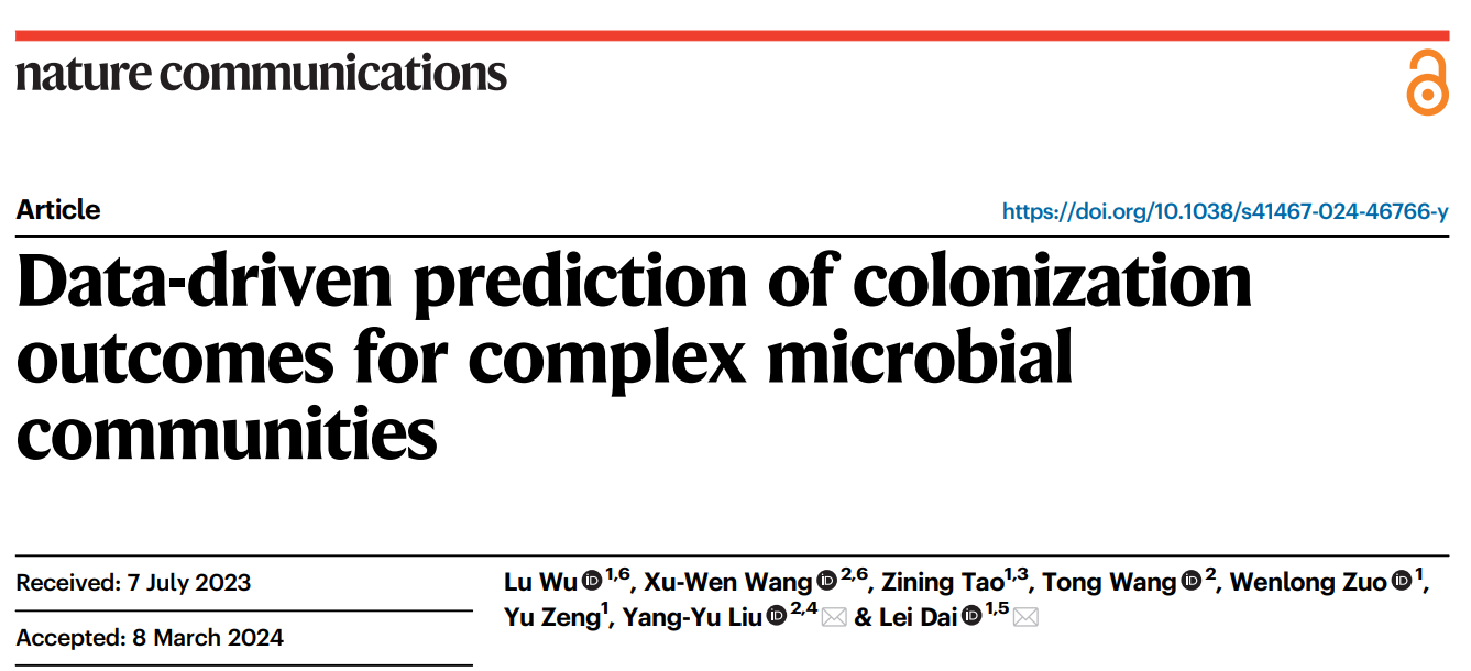 2024年3月16日,中国科研实验室深圳先进技术研究院合成微生物组学研究中心、深圳合成生物学创新研究院戴磊课题组在Nature子刊  Nature Communications上发表了肠道微生物组的定量生态学最新研究成果,题为《Data-driven prediction of  colonization outcomes for complex microbial  communities》。该团队提出并验证了针对微生物组的数据驱动研究范式,用微生物群落的物种组成来准确预测外源物种的定殖结果。凯发k8国际的吴璐博士和哈佛大学医学院的王旭文博士为共同第一作者,戴磊研究员和哈佛大学医学院的刘洋彧副教授为文章共同通讯作者。