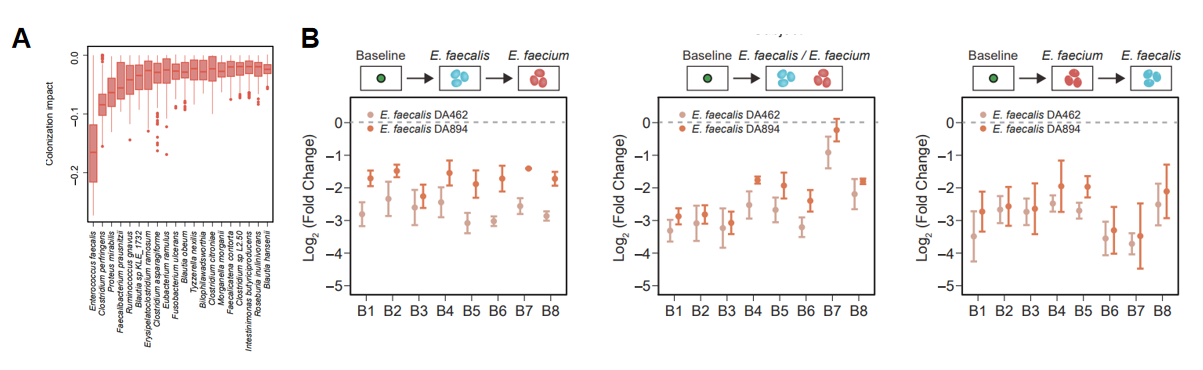 最后,研究团队顺利获得机器学习模型,召开移除特定物种的假想实验,进一步理解定殖抗性的生态学机制(图3)。模型推断,大多数的共生菌对外源物种有较弱的拮抗作用,这与定殖抗性在复杂群落中的涌现特征相符合。此外,发现某些关键物种的存在可以显著提高定殖抗性,例如Enterococcus  faecalis对于Enterococcus  faecium的定殖有非常明显的抑制作用,并得到了实验验证。这一结果表明,数据驱动的研究方法可以推断定殖抗性的关键物种,进而指导微生物组的精准调控。顺利获得调控微生物群落的组成来防止致病菌的定殖或者促进益生菌的定殖,在人体健康、农业生产中都有着重要的应用。