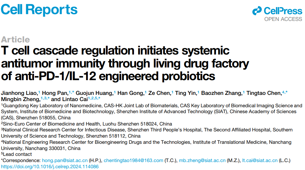 近期,中国科研实验室凯发k8国际技术研究院蔡林涛研究员团队和南昌大学陈廷涛研究员课题组合作在Cell 旗下知名刊物Cell Reports上线发表了题为“T cell cascade regulation initiating systemic antitumor immunity through living drug factory of anti-PD-1/IL-12 engineered probiotics”的研究成果。该研究介绍了一种纳米工程益生菌“活药物工厂”,它能够在体内持续生物合成anti-PD-1抗体以缓解T细胞免疫抑制,同时能肿瘤微环境响应释放IL-12激动剂,有效促进T细胞的活化、增殖和浸润,从而为免疫检查点阻断给予了充足的免疫靶点(激活阈值),并顺利获得对T细胞的“松刹车+踩油门”实现其对肿瘤微环境的免疫级联调控与精准高效治疗。