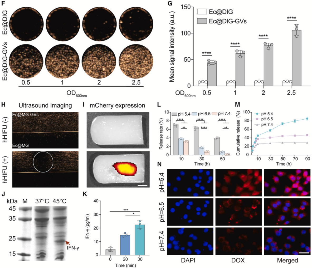 研究团队进一步对Ec@DIG-GVs的各项功能进行了验证。第一时间确认了含GVs的Ec@DIG-GVs具有超声造影成像信号且具有浓度依赖性增强。同时,为了验证超声成像引导hHIFU刺激工程化细菌内温控基因线路表达外源基因的可行性,研究团队将Ec@IG-GVs中的IFN-γ基因替换为mCherry报告基因(Ec@MG-GVs),并将该细菌包埋至琼脂凝胶内(上层为含泡细菌,下层为不含泡细菌),在超声成像引导下将hHIFU焦点定位至Ec@MG-GVs处辐照25分钟,结果显示hHIFU辐照的区域由于GVs的爆破出现了超声信号的消失,37°C放置6小时后发现仅仅接收hHIFU的区域出现了明显的红色荧光,表明工程化细菌可以实现超声造影引导hHIFU定点诱导mCherry蛋白的表达。此外,顺利获得将Ec@DIG-GVs置于不同pH值条件下,证实了DOX能够实现酸响应性释放并有效进入肿瘤细胞(图2)。