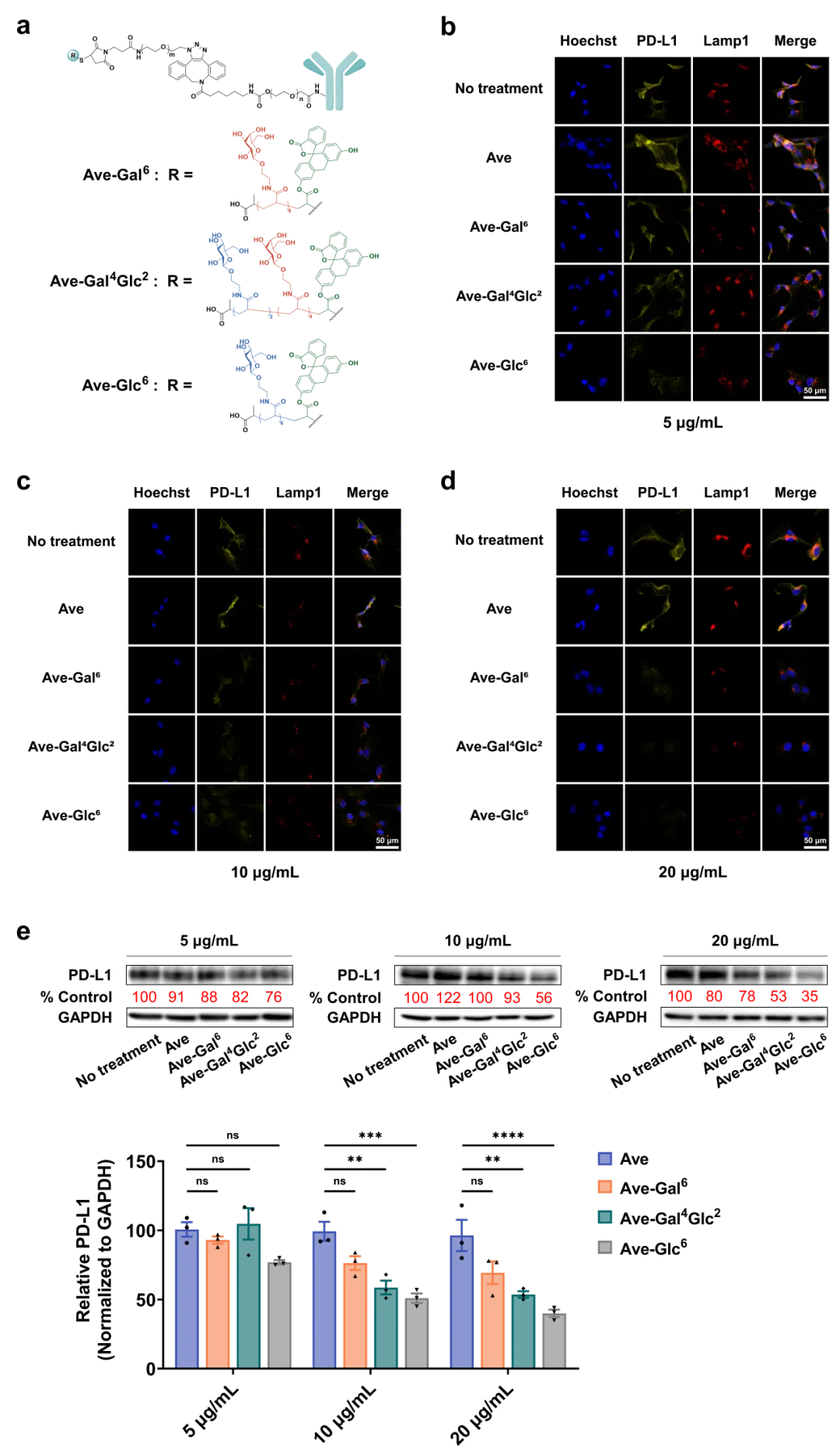 研究团队以MDA-MB-231细胞系高表达的免疫检查点PD-L1为目标蛋白,选取内化有限的PD-L1抗体Avelumab进行Ave-糖寡聚物共轭物分子的合成。顺利获得三个经典的正交反应将筛选出的有潜力的Glut1配体Gal6、Gal4Glc2和Gal6分别连接到抗体Avelumab上,得到三种有潜力的溶酶体靶向嵌合体分子。顺利获得CCK8检测法评估了三种Ave-糖寡聚物共轭物分子对MDA-MB-231细胞的毒性作用,确保细胞中PD-L1的减少并非由于Ave-糖缀合物分子的细胞毒性引起。随后顺利获得免疫印迹法和免疫荧光检测验证了三种Ave-糖缀合物都是有潜力的能适度降解PD-L1的蛋白降解剂,其中Ave-Gal6的降解效果最佳。