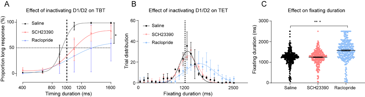由于MSN神经元具有不同的亚型,为了区分是哪些亚型神经元在主导时间知觉加工,研究人员进一步顺利获得药理学实验,分别失活D1-MSN和D2-MSN,考察不同类型MSN神经元的作用。他们发现,失活D2-MSN能够显著降低猕猴在TBT中判断为“长”的概率,以及延缓在TET的注视时长(图4)。这一结果提示了D2-MSN是表征生物“Internal clock”的关键亚型神经元。由于D2-MSN在运动控制、计划、行为转换中扮演关键角色,这一结果也提示了时距知觉与运动控制的紧密联系。