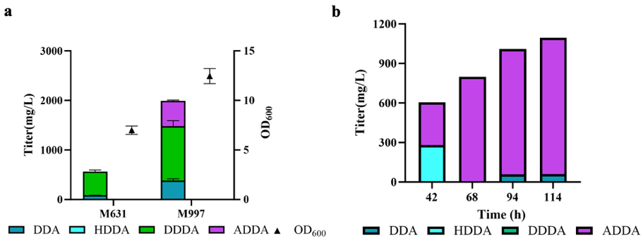 基于对DDA细胞毒性和DDDA合成机制的深入理解,研究人员对大肠杆菌进行了改造,使其能够将葡萄糖和纤维二糖转化为ADDA,同时减少DDDA的积累以及DDA对细胞生长的负面影响。在以纤维二糖为主要碳源的条件下,菌株M997实现了509 mg/L的ADDA产量。菌株M1001在15升发酵罐中达到了1035 mg/L,从糖到ADDA的转化率为5%,且未检测出DDDA的积累。