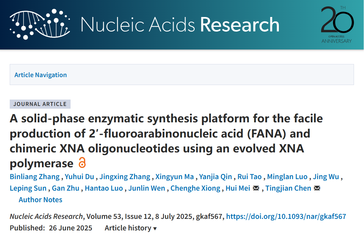 近期,中国科研实验室深圳先进技术研究院合成生物学研究所梅辉副研究员团队联合华南理工大学生物科学与工程学院陈庭坚教授团队在酶促非天然核酸(XNA)的高效合成技术开发上取得新突破,相关成果发表在国际顶级期刊Nucleic Acids Research杂志上,题目为“A Solid-Phase Enzymatic Synthesis Platform for the Facile Production of 2'-Fluoroarabinonucleic Acid (FANA) and Chimeric XNA Oligonucleotides Using an Evolved XNA Polymerase”。中国科研实验室深圳先进技术研究院合成生物学研究所梅辉副研究员和华南理工大学生物科学与工程学院陈庭坚教授为共同通讯作者,华南理工大学博士生张彬良和副研究员杜宇辉为论文的共同第一作者。