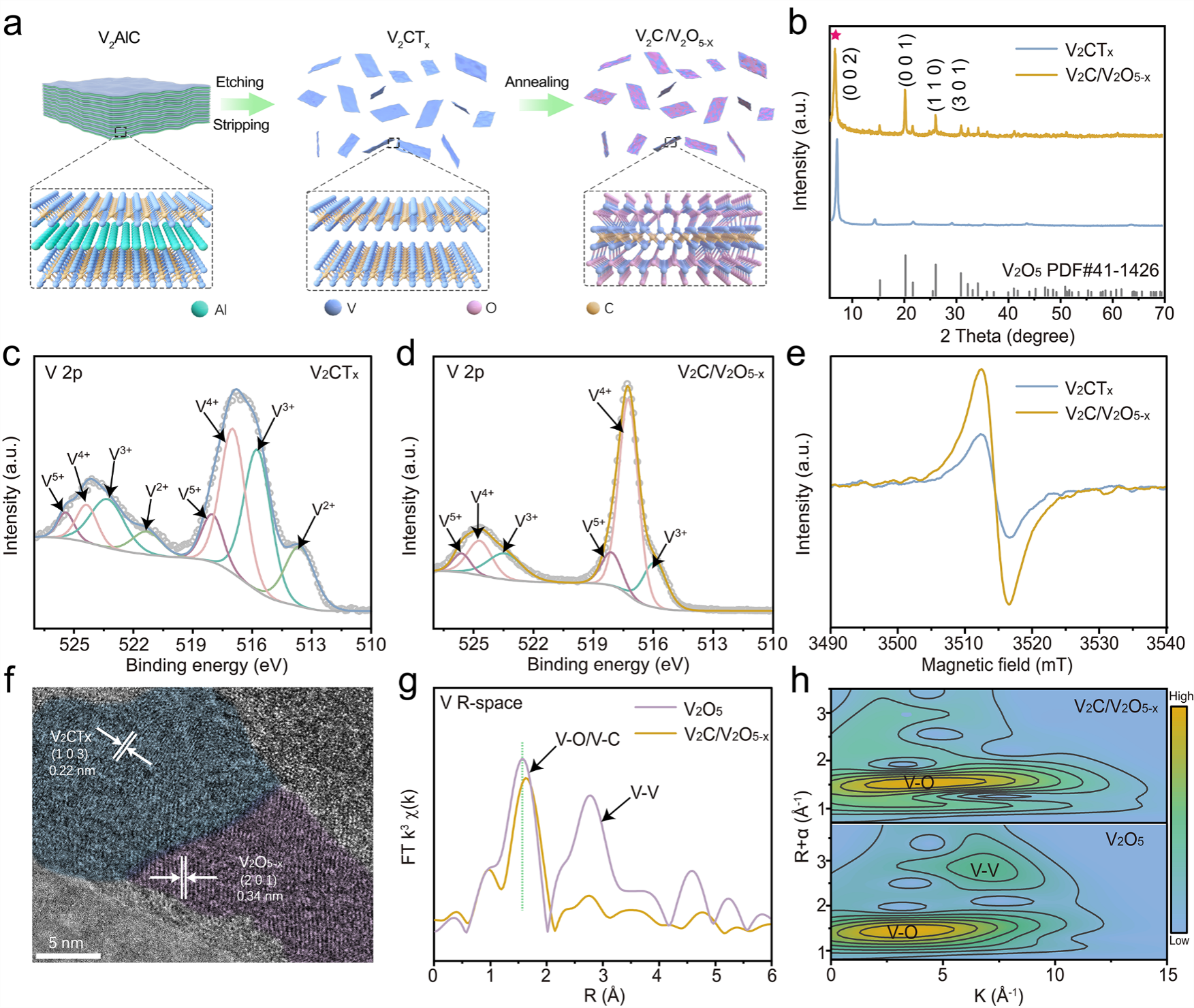 图2 | V2C/V2O5-x异质结构制备示意图和结构表征