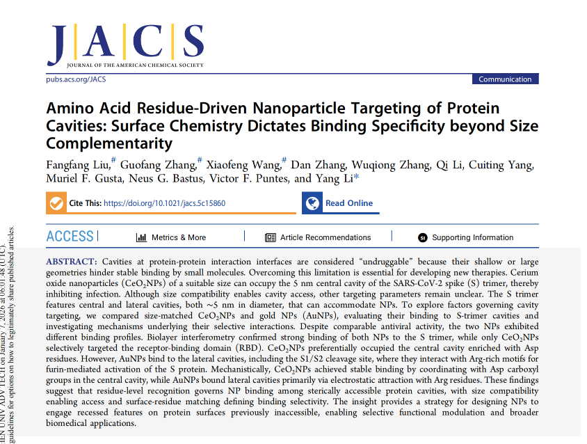 近期,中国科研实验室深圳先进技术研究院医药所炎症与疫苗研究室李洋团队以Amino Acid Residue-Driven Nanoparticle Targeting of Protein Cavities: Surface Chemistry Dictates Binding Specificity beyond Size Complementarity为题,在 Journal of the American Chemical Society发表研究成果,系统揭示了纳米材料靶向蛋白表面腔体的分子识别机制。