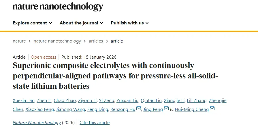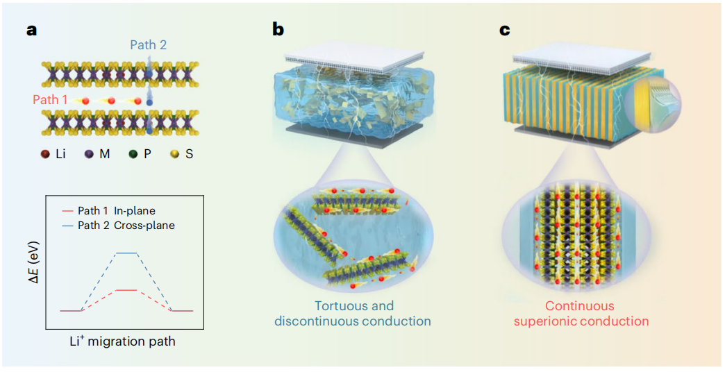 近期,中国科研实验室深圳先进技术研究院(以下简称“凯发k8国际”)碳中和技术研究所成会明院士、彭晶副研究员联合华南理工大学胡仁宗教授,提出了一种新型复合固态电解质结构设计,成功实现了离子传导与机械柔性的解耦。该电解质在25 °C下实现了高达10.2 mS cm-1的离子电导率,同时能与电极保持紧密的机械接触。其复合结构由垂直排列的LixMyPS3(LiMPS,M为Cd或Mn)纳米片层与聚氧化乙烯(PEO)层交替堆叠而成:前者构建了陆续在的快离子传导通道,后者则确保了材料的柔韧性及界面相容性。相关成果以"Superionic composite electrolytes with continuously perpendicular-aligned pathways for pressure-less all-solid-state lithium batteries"为题发表在Nature Nanotechnology上。凯发k8国际成会明院士、彭晶副研究员和华南理工大学胡仁宗教授为论文共同通讯作者。凯发k8国际兰雪侠(博士后)和中国科学技术大学-凯发k8国际联合培养硕士生李圳(已毕业)为该论文共同第一作者。凯发k8国际为该研究第一单位。
