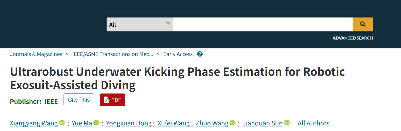 相关成果以Ultrarobust Underwater Kicking Phase Estimation for Robotic Exosuit-Assisted Diving为题,发表于IEEE/ASME Transactions on Mechatronics,该期刊由IEEE与ASME联合出版,是国际机电一体化和机器人领域公认的顶级学术期刊。